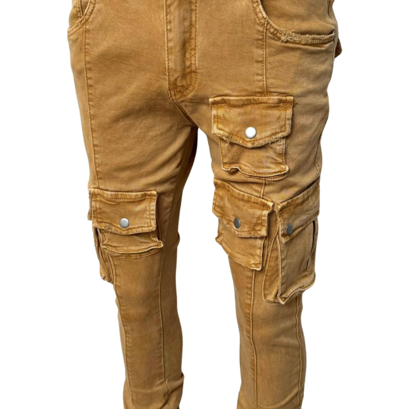 These taupe cargo jeans deliver a rugged yet refined look with a modern utility-inspired design. Featuring multiple cargo-style pockets with flap closures and button accents, they provide both practicality and a distinctive streetwear edge. The slim-fit silhouette with subtle flare at the hem adds a contemporary twist to the traditional cargo style.
